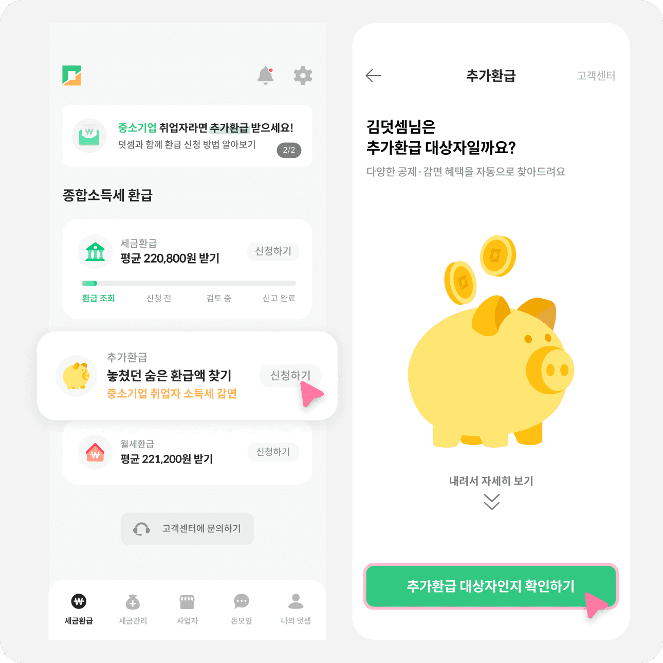 덧셈에서 추가로 받을 수 있는 예상 환급액을 바로 확인하고, 서비스 신청까지 한 번에 처리할 수 있어요!