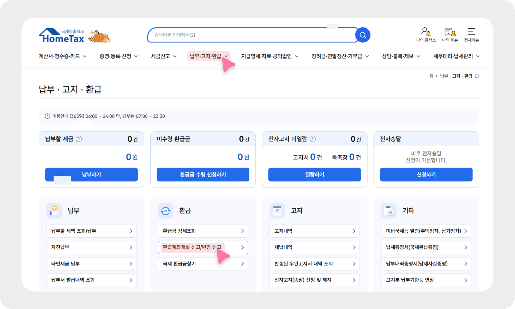 [홈택스 로그인 → 납부 고지 ・ 환급 → 환급계좌개설 신고/변경 신고]
