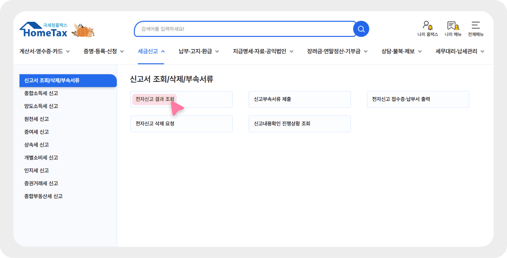 1️⃣ 홈택스↗️ 접속 후 로그인 후 → [세금신고] → [신고서 조회/삭제/부속서류] → [전자신고 결과 조회]