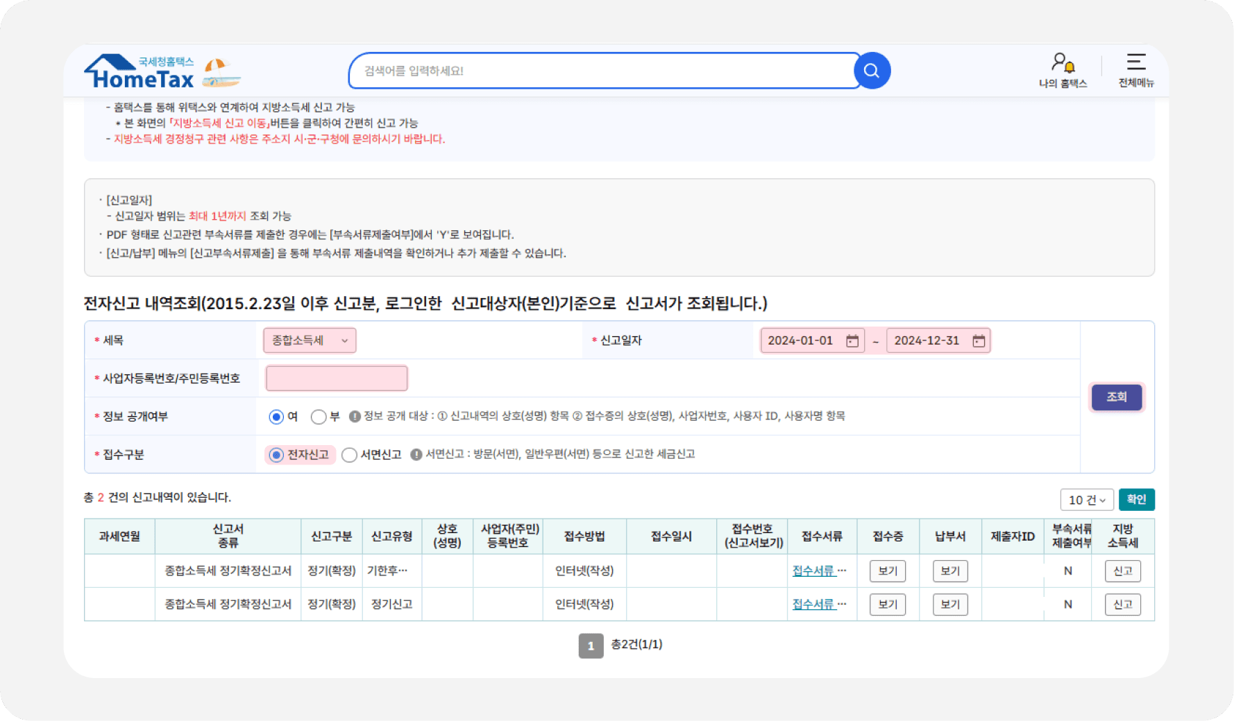 2️⃣ [세목] ‘종합소득세’ 선택 → [신고일자] 기간 설정 → [주민등록번호] 입력 → [접수구분] ‘전자신고’ 선택 → [조회하기]