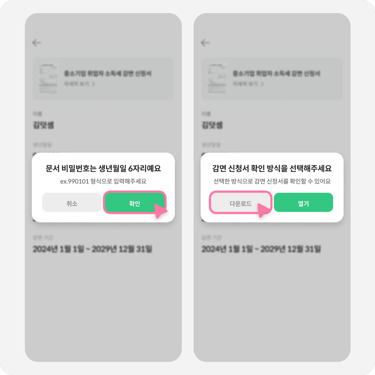 2️⃣ 문서 비밀번호 관련 안내사항 [확인] 버튼 클릭 → 감면 신청서 확인 방식 [다운로드] 버튼 클릭