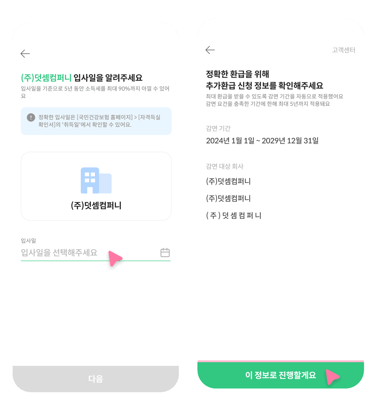 이미 감면 혜택이 적용이거나 입사일 확인이 자동으로 완료되었다면 이 절차는 생략될 수 있어요!