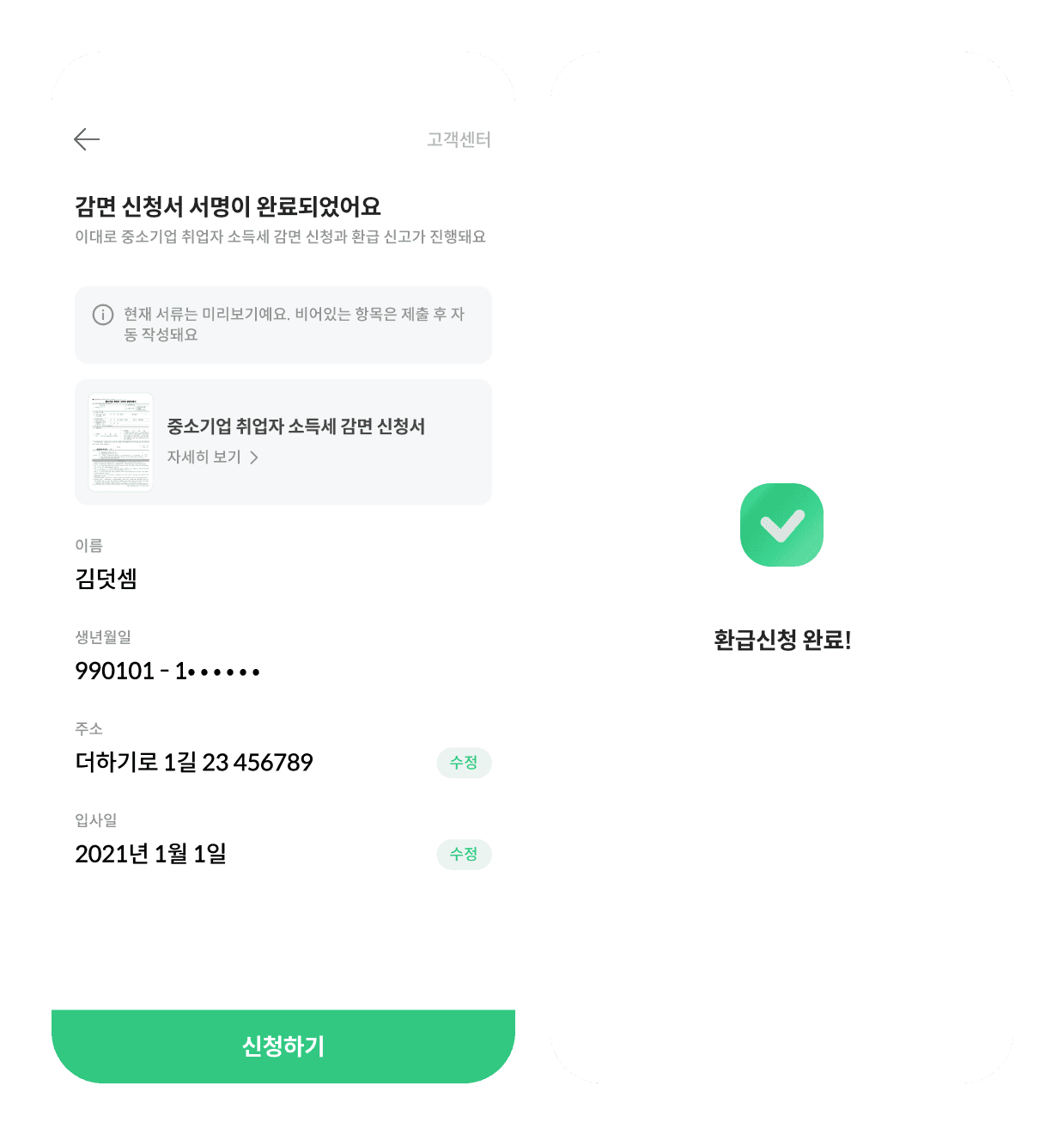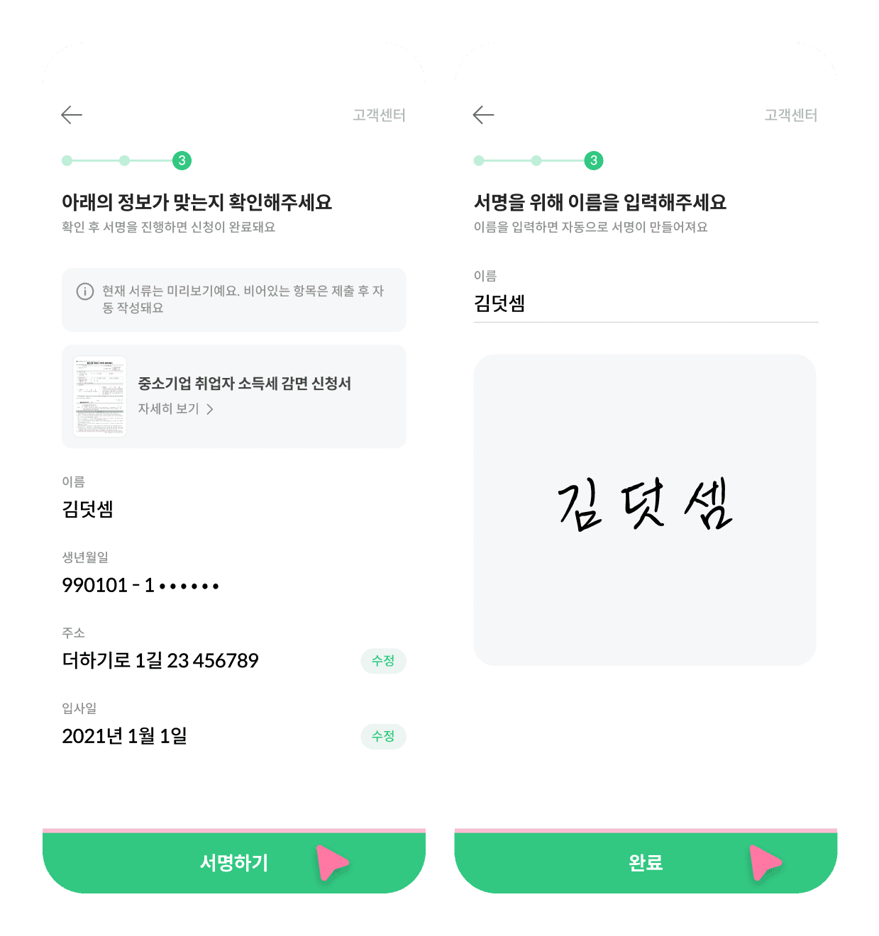 작성한 정보가 맞는지 확인 후 [서명하기] 클릭 → 서명을 위해 이름을 입력하고 [완료] 클릭