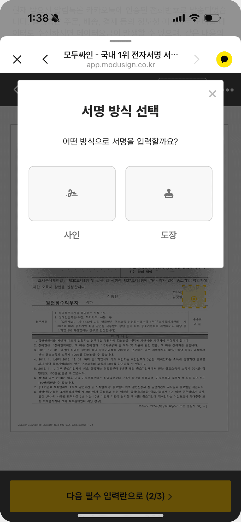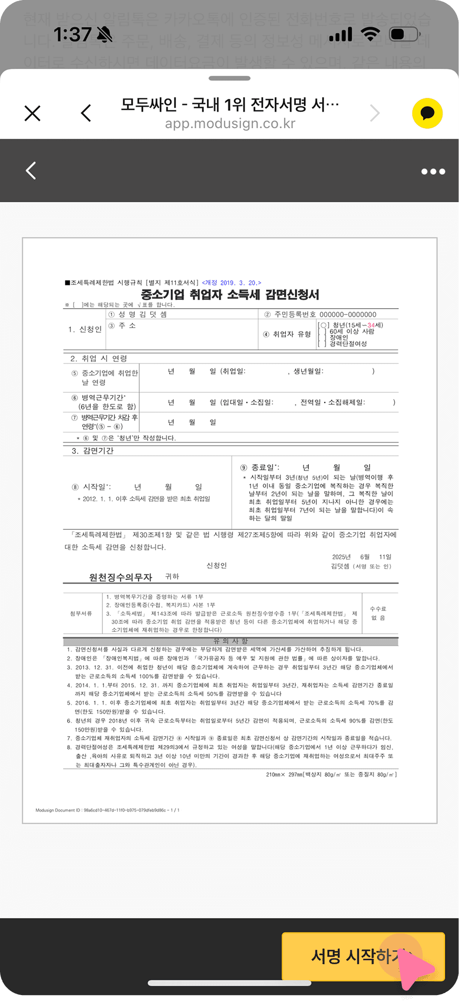 추가환급 신청 완료 → '모두싸인' 감면 신청서 카카오 알림톡에서 다음 절차 진행