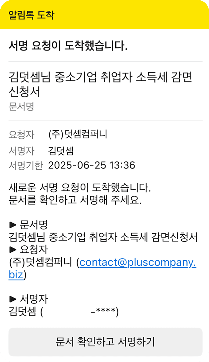 추가환급 신청이 완료되면 영업일 기준 3일 이내에 덧셈에서 '모두싸인' 중소기업 취업자 소득세 감면신청서 서명 요청 카카오 알림톡이 발송돼요!