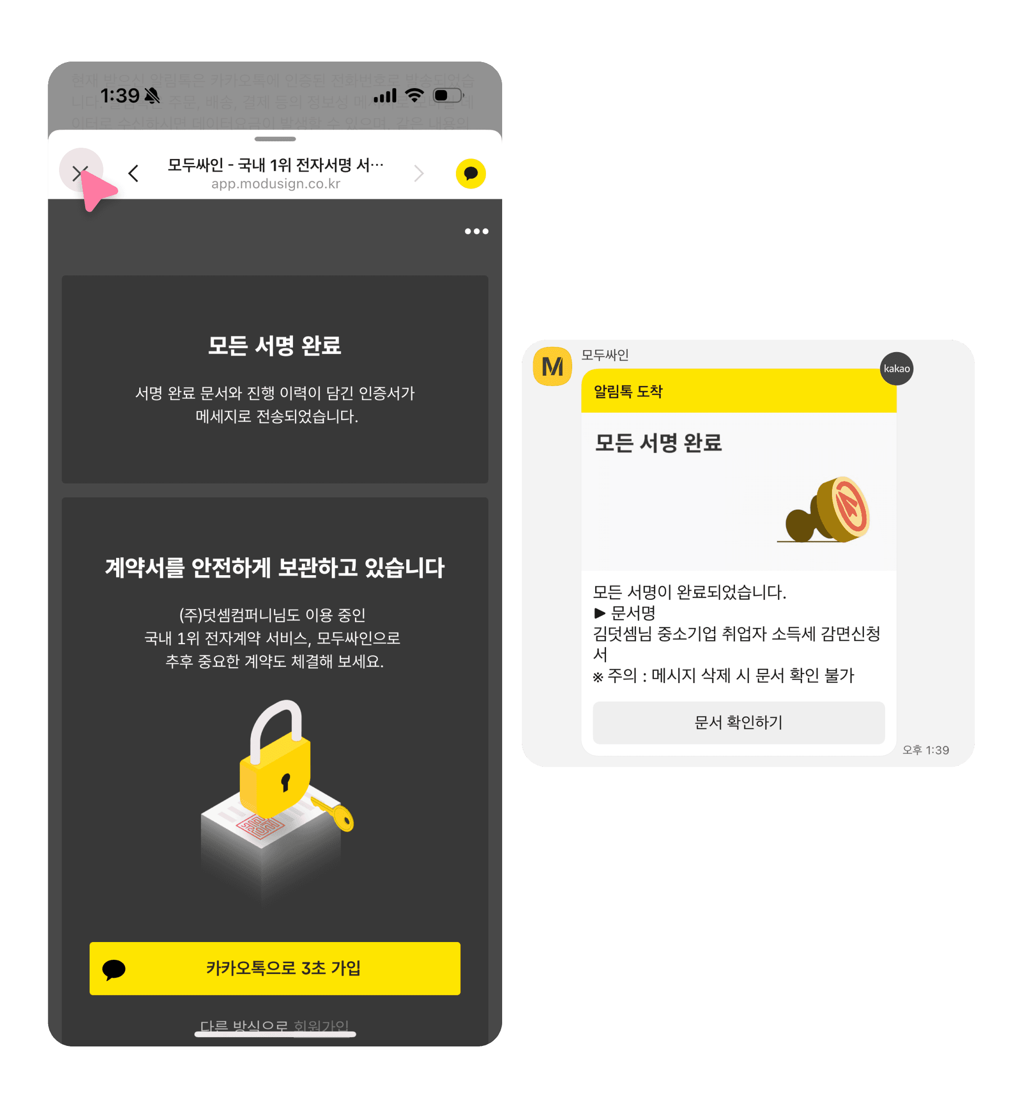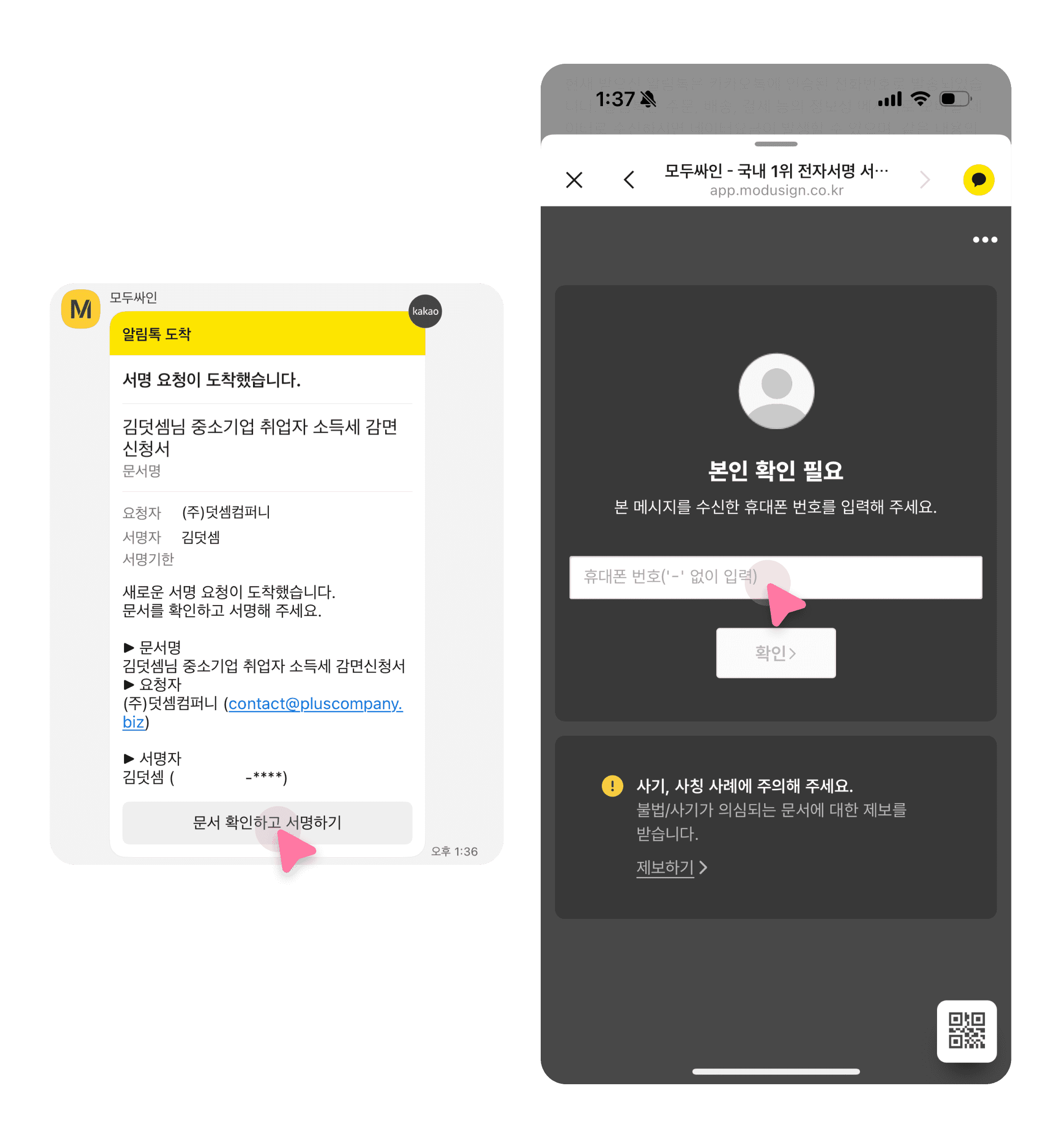 모두싸인 서명 알림톡 [문서 확인하고 서명하기]버튼 클릭 → 휴대폰 번호로 본인 확인 진행